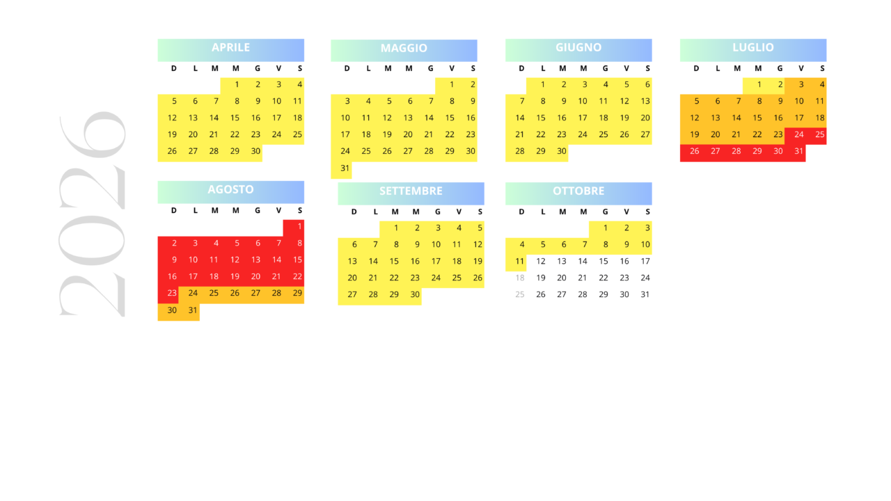 Il nostro calendario si suddivide in 3 stagioni: gialla, arancione e rossa. Controlla sul calendario la tariffa del tuo soggiorno e verifica i prezzi nella tabella apposita. LE TARIFFE AGEVOLATE, VANNO RICHIESTE AD INIZIO SOGGIORNO.